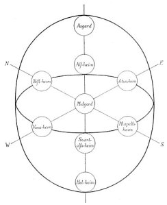Alfheim (lumea elfilor luminii), Asgard ( tărâmul zeilor Aesir, zeii războiului și puterii), Helheim (tărâmul morților unde ajung cei ce mor din cauza bolilor sau a bătrâneții), Jotunheim (lumea giganților de piatră și greață,numiți într-un singur cuvânt, Jötunni), Midgard ( tărâmul oamenilor, traducându-se prin „lumea de mijloc”, deoarece se află în mijlocul Copacului Lumii, Yggdrasyl), Muspelheim ( tărâmul flăcărilor, al giganților de foc; scântei din Muspelheim au format stelele, cometele și planetele),Niflheim (țara negurilor, ghețurilor și frigului), Svartalheim (lumea elfilor întunecați), Vanaheim (lumea Vanir , divinități în dușmănie cu Aesir, asociați cu fertilitatea,natura, magia și abilitatea de a prezice viitorul).