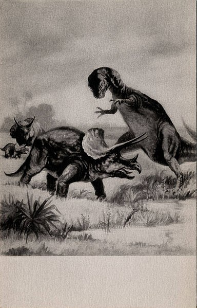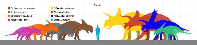 3.Triceratops.Triceratops a fost un dinozaur erbivor care a trăit la sfârșitul stadiului Maastrichtian din perioada Cretacicului Târziu, în urmă cu 68 sau 65 de milioane de ani.Numele său înseamnă „față cu trei coarne”, și derivă din limba greacă: tri înseamnă „trei”, ceras înseamnă „corn”, iar ops înseamnă „față”.