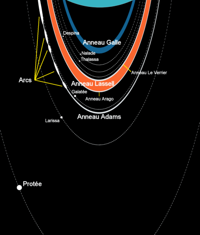 Trei dintre inele sunt înguste, cu lățimi de aproximativ 100 km maximum; Galle și Lassell, pe de altă parte, sunt foarte largi – între 2.000 și 5.000 km. Inelul Adams este format din cinci arcuri clare, prinse într-un inel continuu mai slab. Mergând în sens invers acelor de ceasornic, arcurile se numesc: Frăție, Egalitate (1 și 2), Libertate și Curaj (Fraternité, Égalité (1 și 2), Liberté și Courage – primele trei după deviza Republicii franceze).